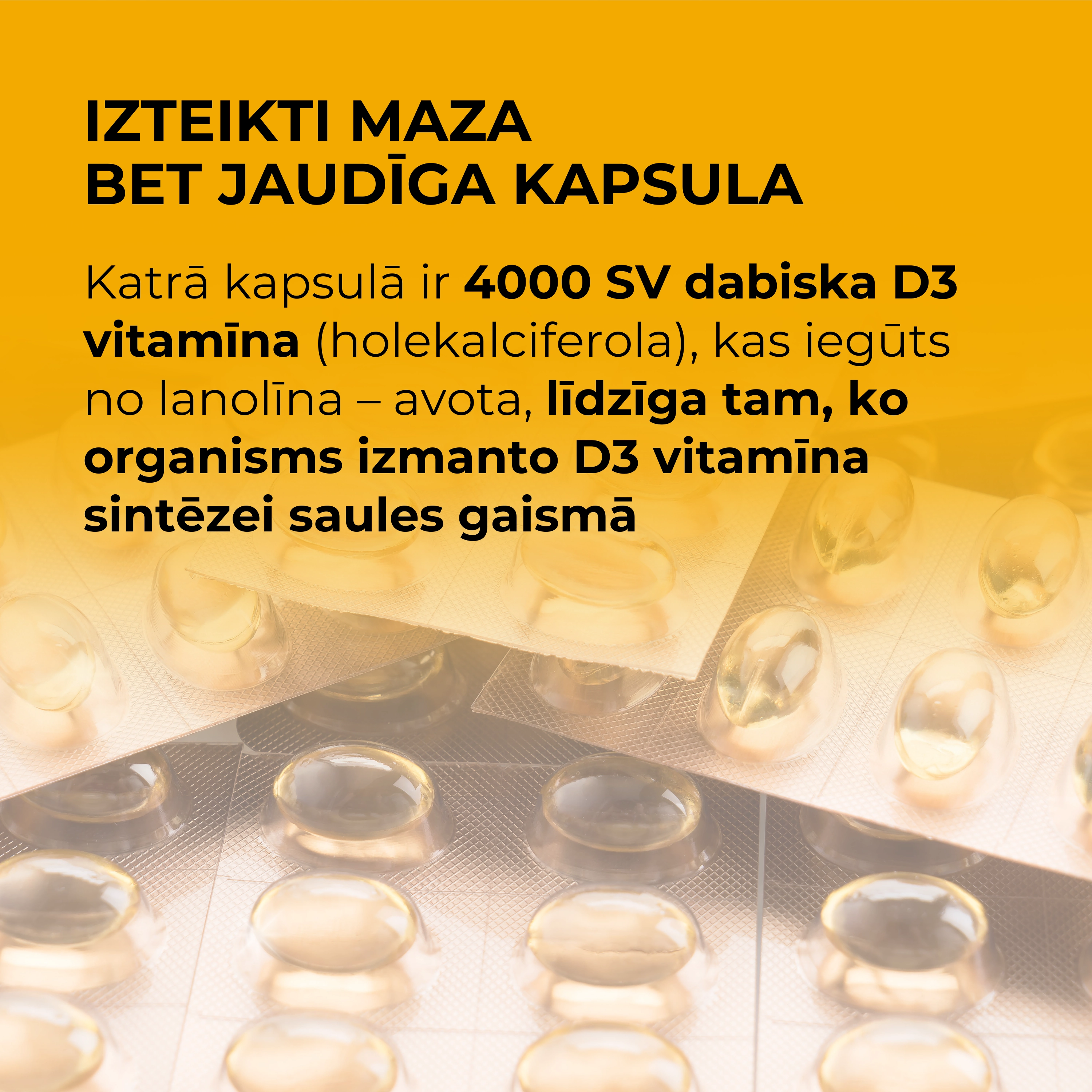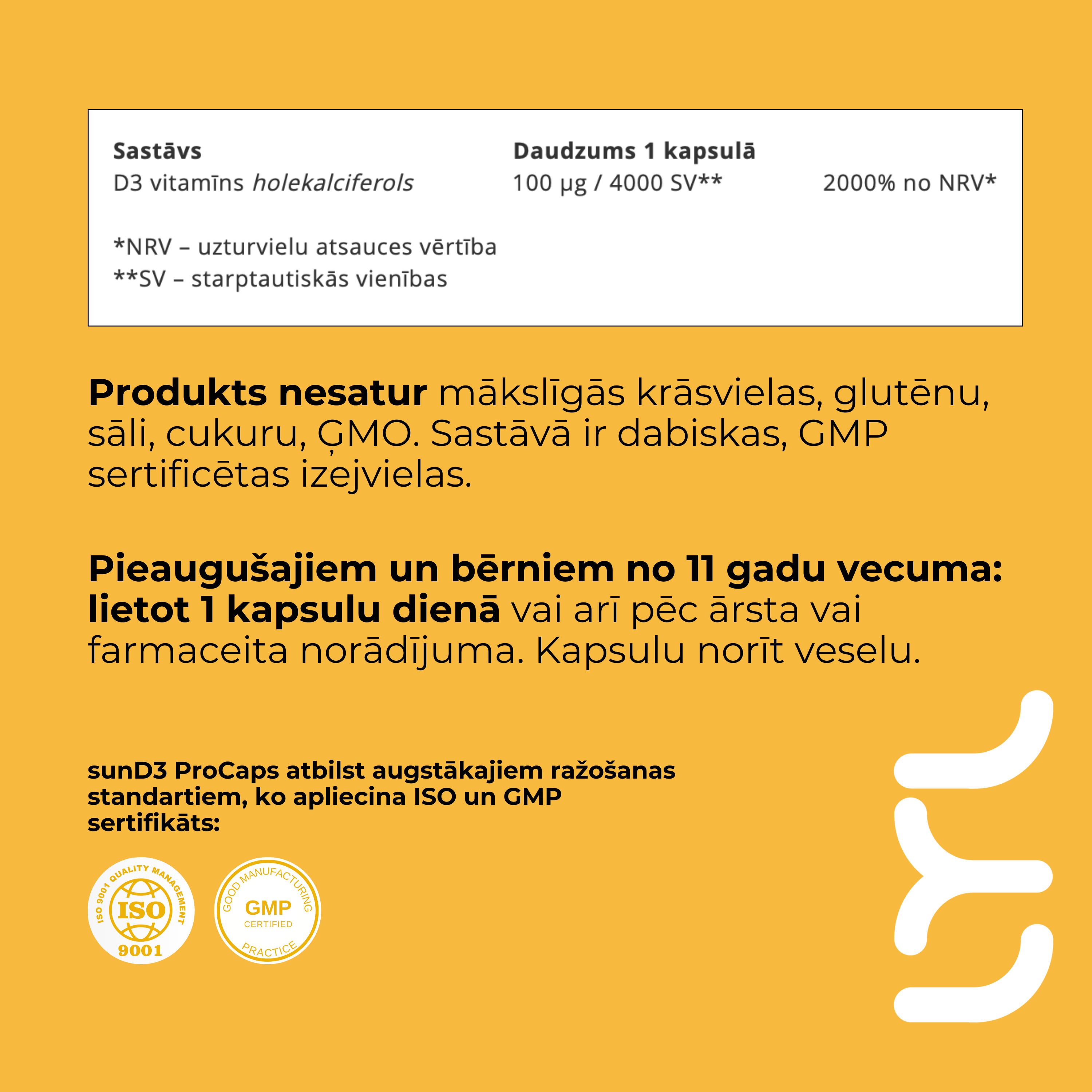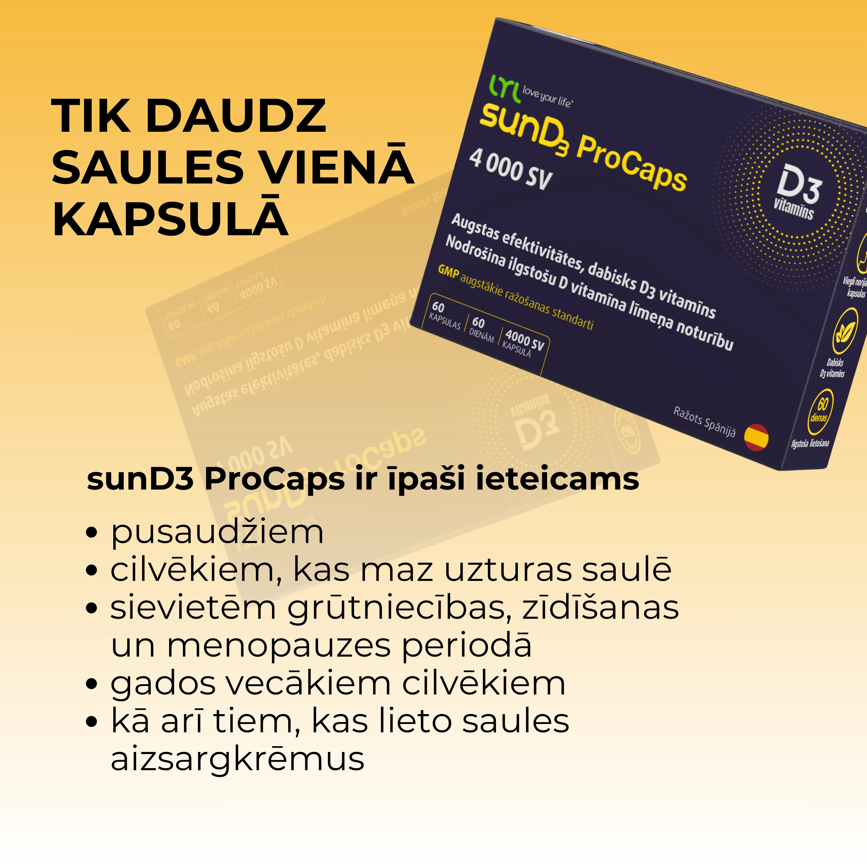 • Katra sunD3 ProCaps kapsula satur 4000 SV dabiska D3 vitamīna, kas iegūts no lanolīna un ir identisks tam, ko organisms sintezē saules gaismas ietekmē