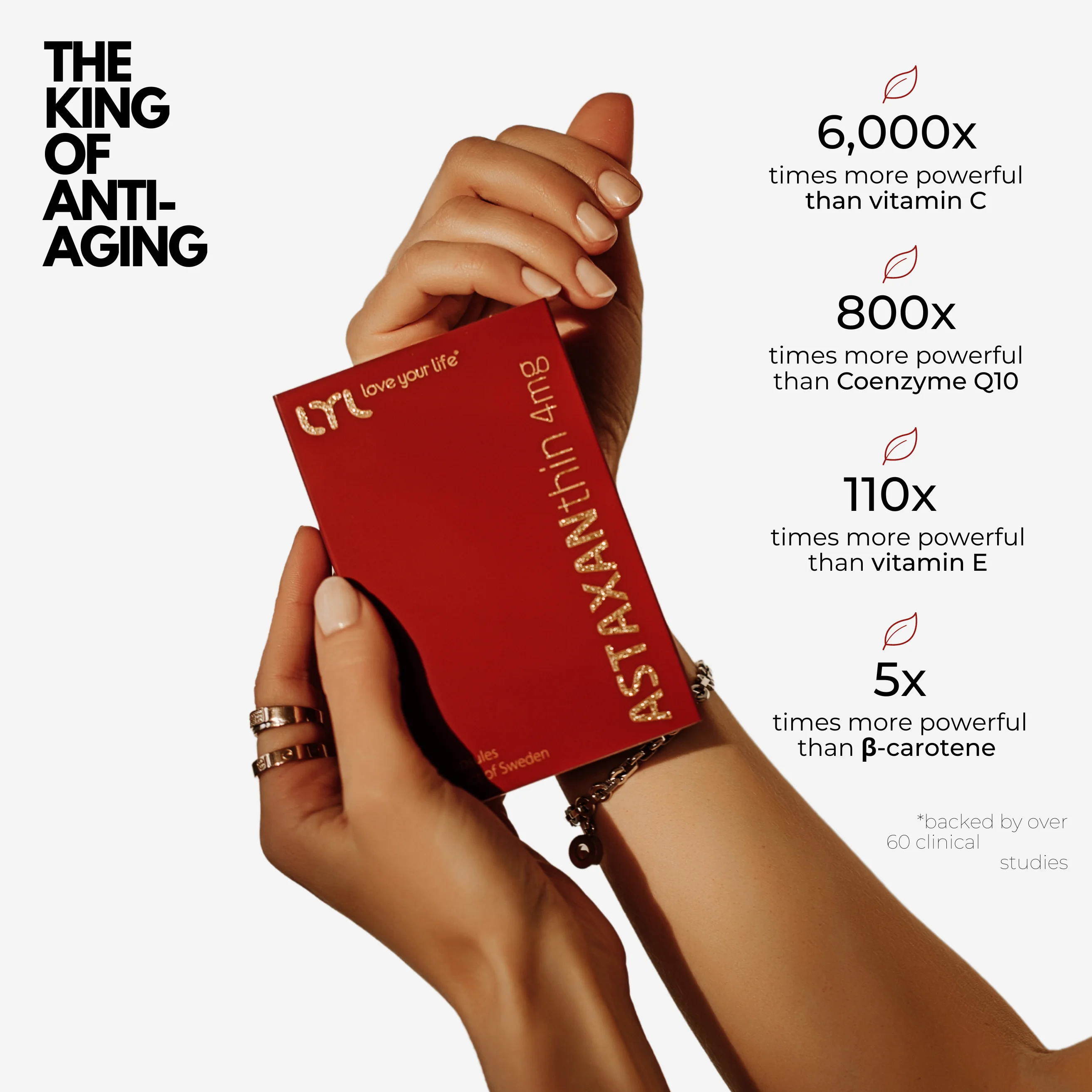 ASTAXANthin offers effective skin protection, reducing the appearance of wrinkles, hyperpigmentation, and aiding in the recovery of DNA damage caused by UV radiation!