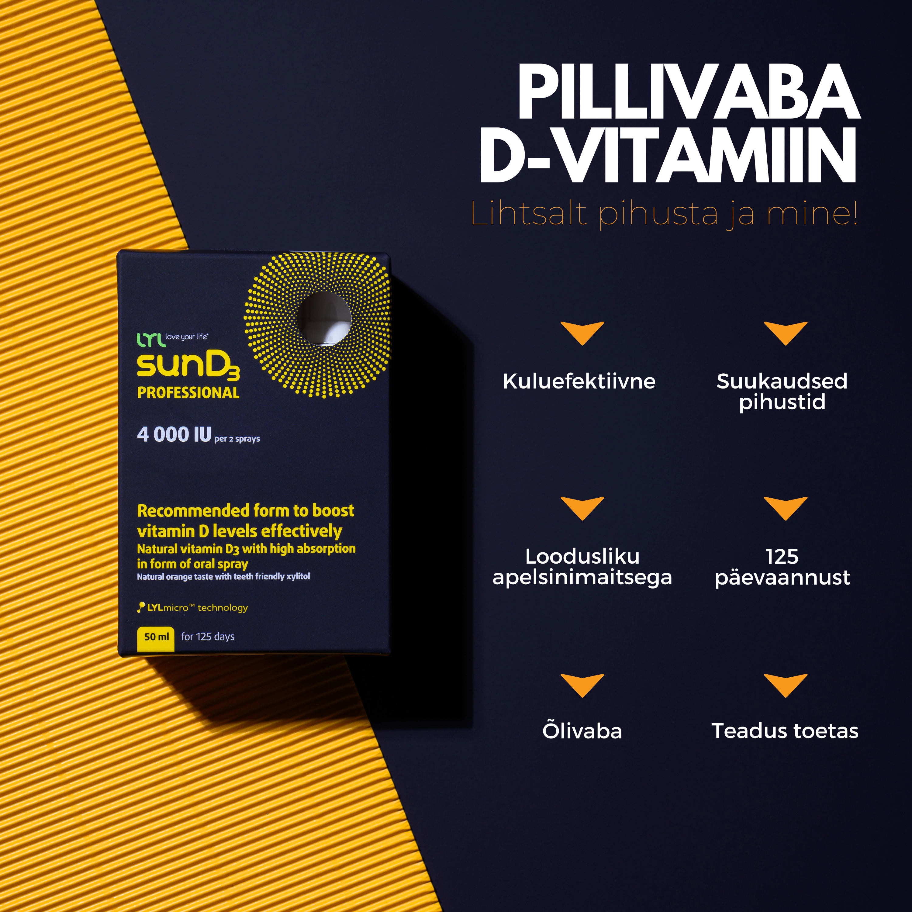 - LYLsunD3 KID 600 RÜ – eriti säästlik D-vitamiin lastele. Loodud selleks, et D-vitamiini manustamine oleks kergesti kontrollitav ja soovitatavat päevast kogust ei oleks võimalik ületada, kuna üks pihusepuhe sisaldab 600 RÜ-d.