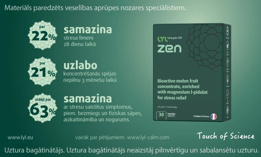 “LYL zen augsti antioksidatīvā sastāva kombinācija nostiprina organisma dabiskās aizsargspējas noturībai pret stresu un nervu pārslodzi, (..) tas ir bagātīgs ar spēcīgāko dabisko antioksidantu superoksīda dismutāzi (SOD) un lieliski pārvalda stresu, liedzot to organismam uzkrāt,” – rakstīts LYL love your life® mājaslapā.3Turpat iepazinos arī ar testu rezultātiem, kas pierādījuši, ka formula LYLcalm™, kuras sastāvā ir mikrokapsulēts Extramel® koncentrāts, samazina stresa līmeni, uzlabo vispārējo labsajūtu, ar mentālo veselību saistīto veiktspēju, veicina fizisko labsajūtu, samazina ar stresu saistītos simptomus, un – vispārēji – piedāvā visaptverošu risinājumu ar unikālu un ilgstošu efektivitāti.4